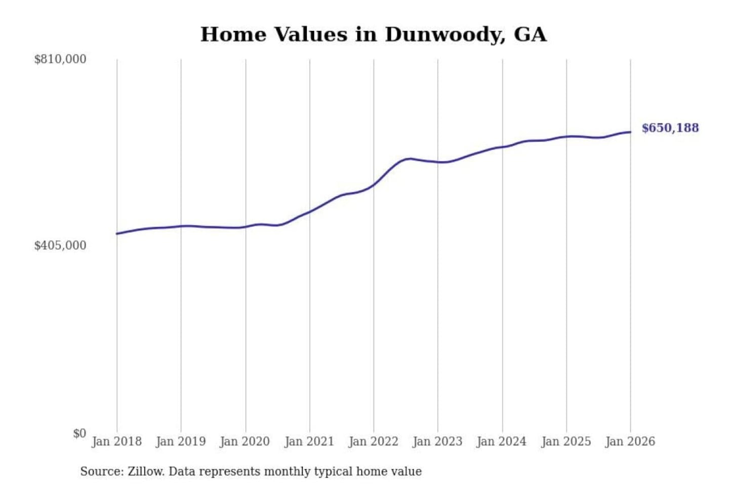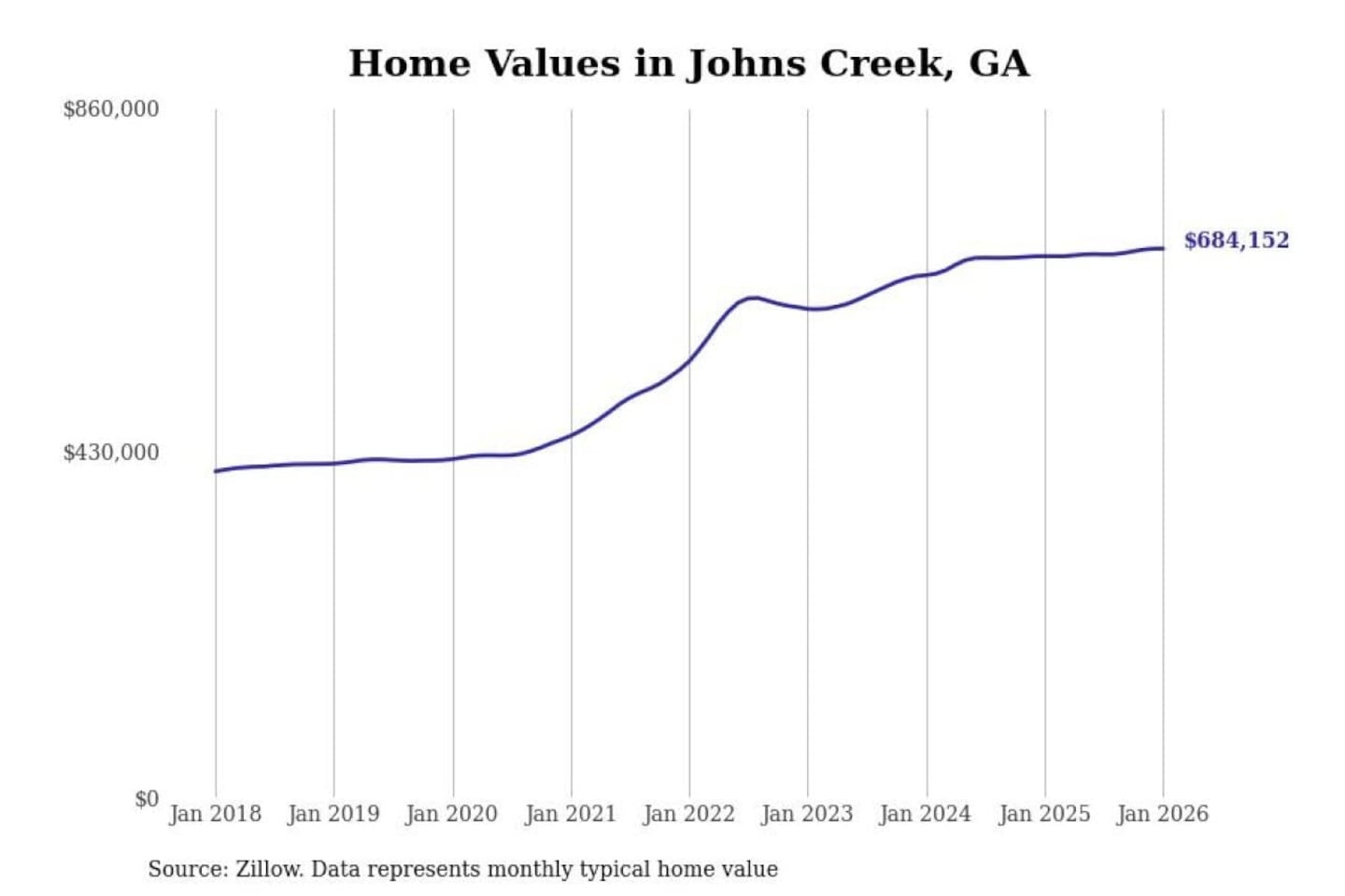 Stacker compiled a list of cities with the most expensive homes in Georgia using data from Zillow. Cities are ranked by the Zillow Home Values Index for all homes as of January 2026. The charts in this story were created automatically using Matplotlib.