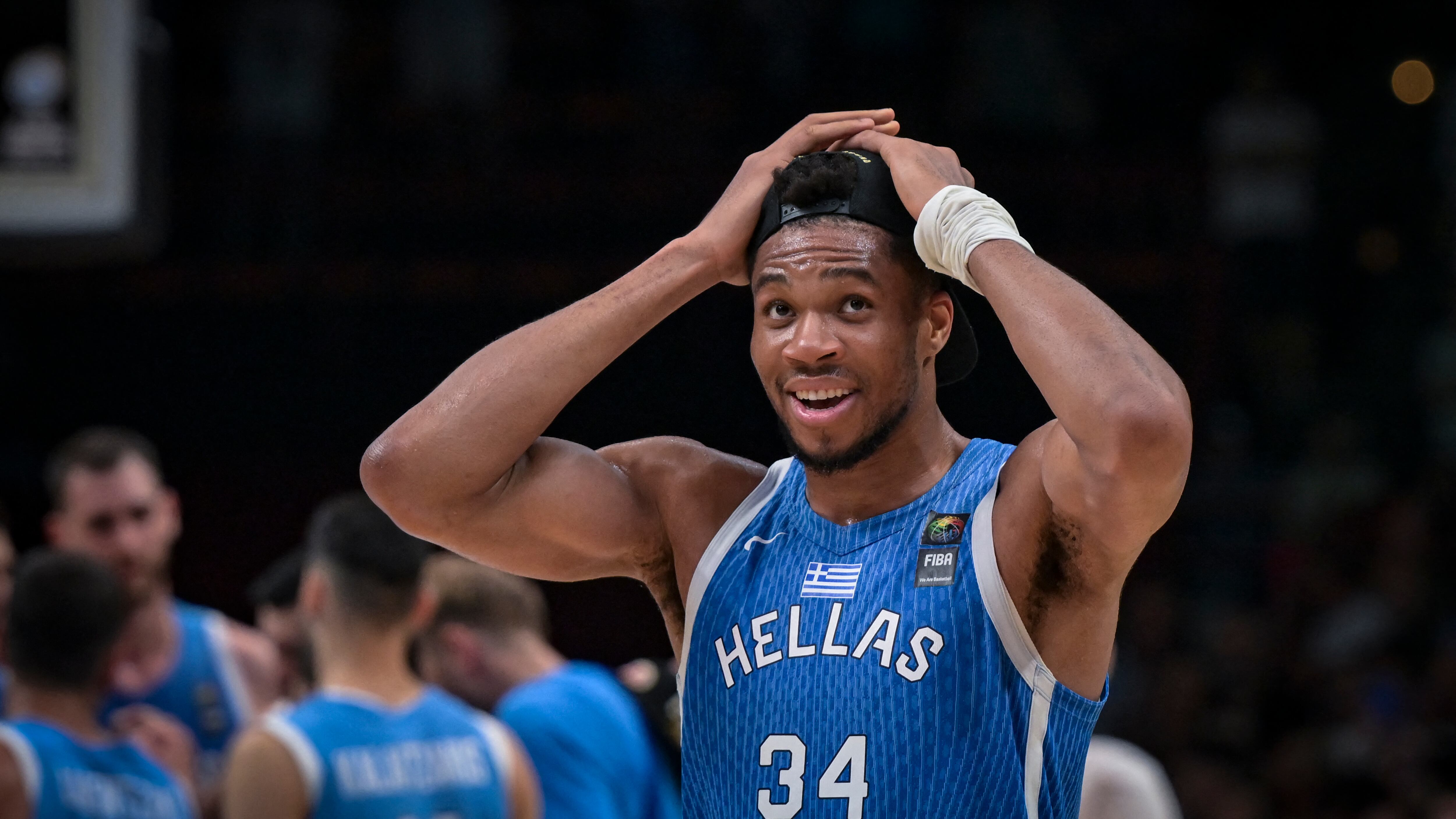 BASKETBALL-OLY-PARIS-2024-CRO-GRE Greece's Giannis Antetokoumpo puts on a cap as he celebrates the win at the end of the final game of the FIBA Olympic Qualifying Tournament between Croatia and Greece at the Peace and Friendship Stadium in Athens on July 7, 2024. (Photo by Aris MESSINIS / AFP) (Photo by ARIS MESSINIS/AFP via Getty Images) (ARIS MESSINIS/AFP via Getty Images)